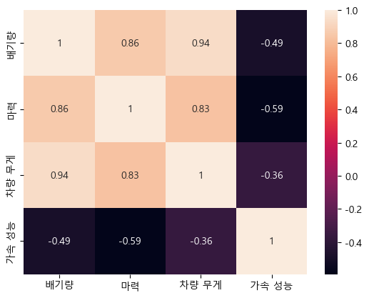2. 마력과 배기량은 상관계수가 낮으므로 배기량을 남기고 마력을 제거한다.